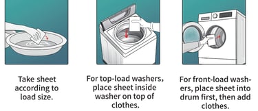 Top-loading machines let water in from the top; therefore, it is best to load clothes first, then place the laundry sheet on top.